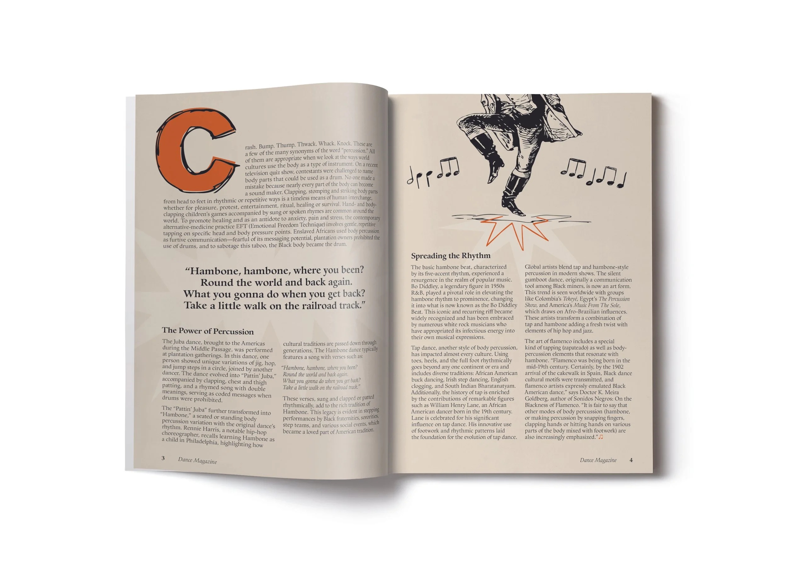 The project required the development of two feature article spreads for Dance magazine. The article discusses the origins and influences of Hambone.
